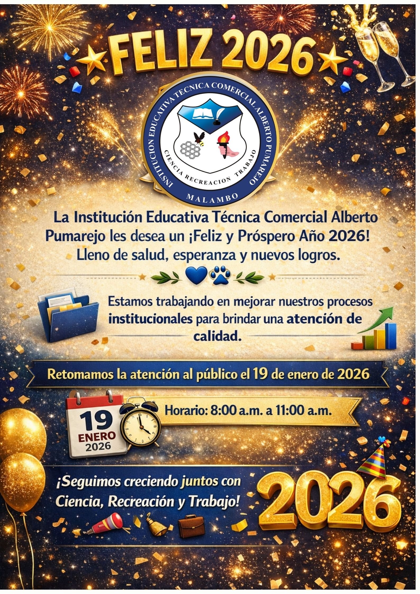 La Institución Educativa Técnica Comercial Alberto Pumarejo desea a toda la comunidad un feliz y próspero año 2026, lleno de salud, esperanza y nuevos logros. 💙🐾